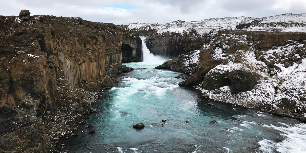 The following days saw us walk through snow-covered fields of lava, past the Hrafnabjargafoss and Aldeyjarfoss waterfalls, pillars of basalt forming an amphitheatre of raging currents and swirling winds. These falls signalled the start of the lowland river and we thought for the first time that we might just make it all the way across the country.