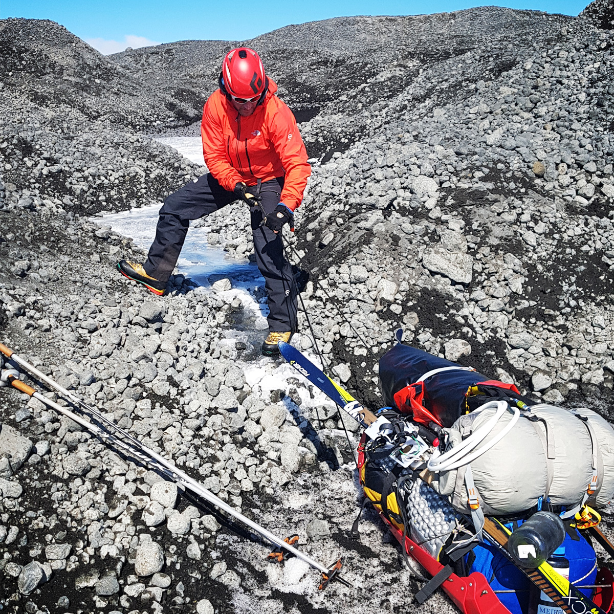 From our final glacier camp we stared down into the Vonarskard, one of the most remote and desolate of Iceland’s high mountain passes. It is a haunting place, steeped in legends of ghosts and outlaws, a place where the Vikings feared to tread and the old gods still roam.    Our entrance into the Vonarskard was shielded by a wall of glacial moraine, 30-40 metres high and skirting the entire base of the glacial tongue. We eventually found a weakness in the defences, a small melt-stream cutting its way through the shale and rock, enough for us to clamber over and haul our sleds through. Finally off the glacier and through the moraine, we dismantled our pulks, modified from their original design to be unscrewed and split into two pieces then stacked together, allowing them to be easily lashed to our rafts and packs. With our rucksacks packed, we descended into the river valley in search of the source.