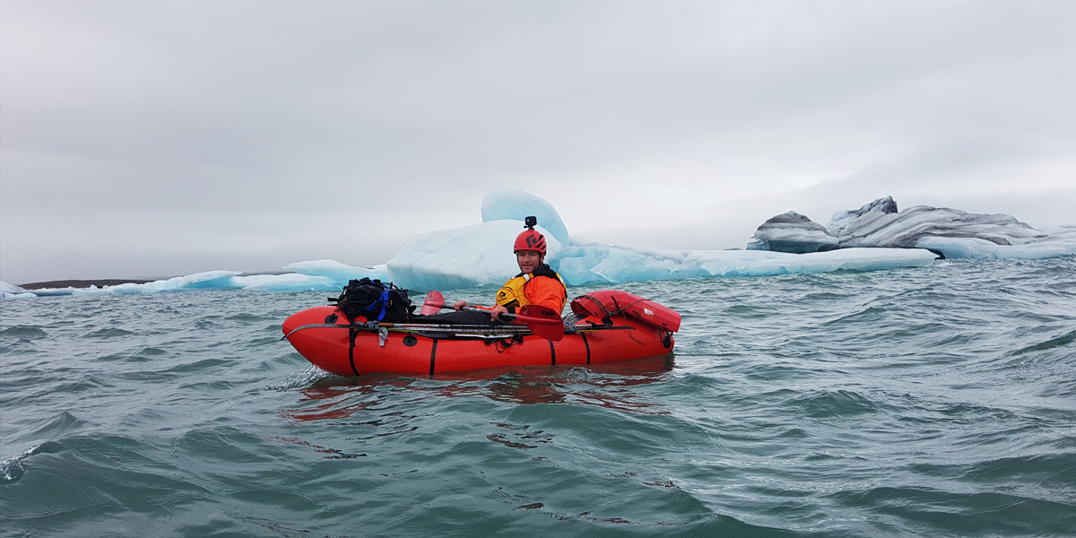 The following morning the cloud level had descended. Across the lagoon the Esjufjoll mountains, our gateway to the Vatnajokull, had disappeared behind a curtain of grey. A light wind ruffled the surface of the water, grey seals bobbed and splashed, watching with interest as we prepared our rafts. We stowed the majority of our gear inside our boats with only essential items strapped to the bow, skis tied down the sides and our pulks lashed onto the back. The three of us paddled out into the lagoon, weaving amongst the icebergs before an emotional farewell saw Dan turn and paddle for home.