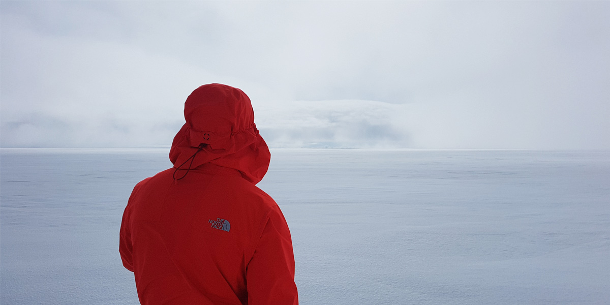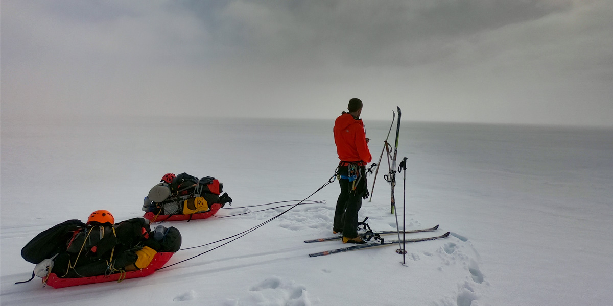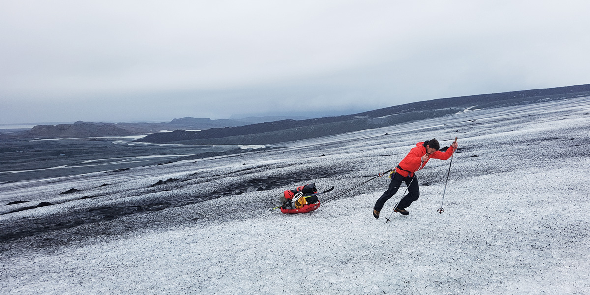After a night of wind and torrential rain, we woke to a monochrome world, our red jackets and yellow tent stark against the ice and rock. We hauled our heavily laden sleds across a collection of melt-rivers to the base of the glacier, the water wider and deeper than the night before due to the incessant rain. The cloud level had dropped further still and soon after beginning our ascent up the lower slopes of the Breidamerkurjokull, we were engulfed in white.
