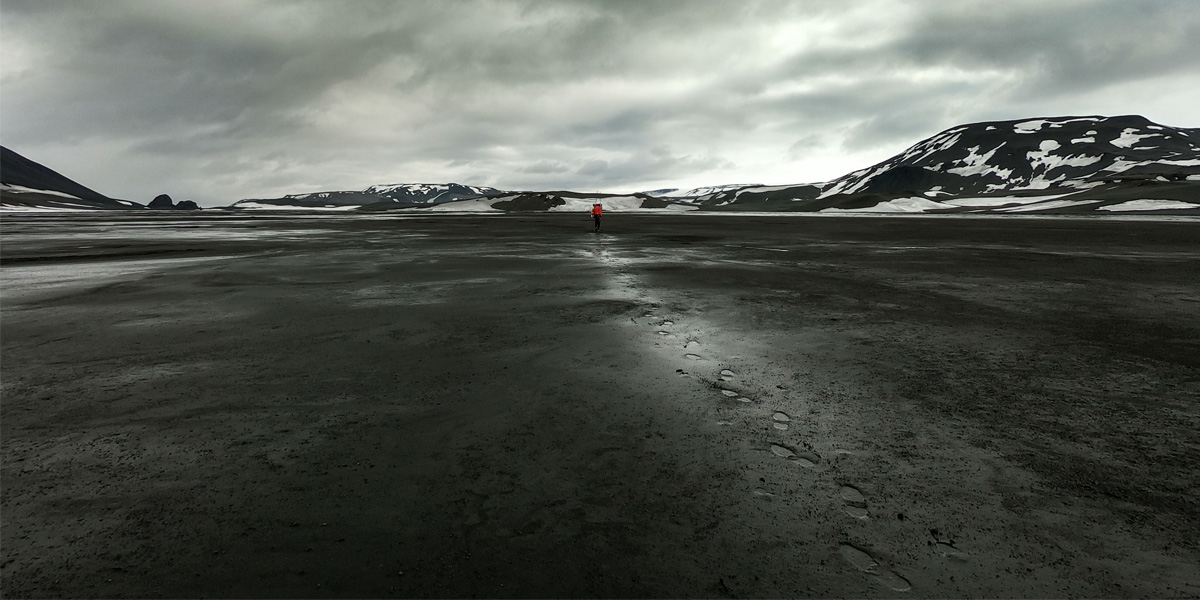 We left our river now as it continued its thunderous course through a series of deep whitewater canyons. It would be three days and around forty kilometres of walking before we would be reunited. Before us lay a gently undulating plateau of black sand. Whaleback ridges etched with snow-patch camouflage extended to the horizon. Thin sunlight stretched across the sky, giving only the faintest hint of warmth. Thick cumulus clouds herded to the North. Soft, dusty sand and sucking mud were our constant companions for three days. Fields of lava slowed our progress further still, a shattered landscape, born of fire and violence. As we walked, we began to see a transition away from the empty highland desert. Spring rose up around us and wetlands emerged. Wading birds had started to return. Banks of grass and flowers woke from their slumber beneath the snow. Highland streams brought movement, energy and life to a scarred and blackened land.