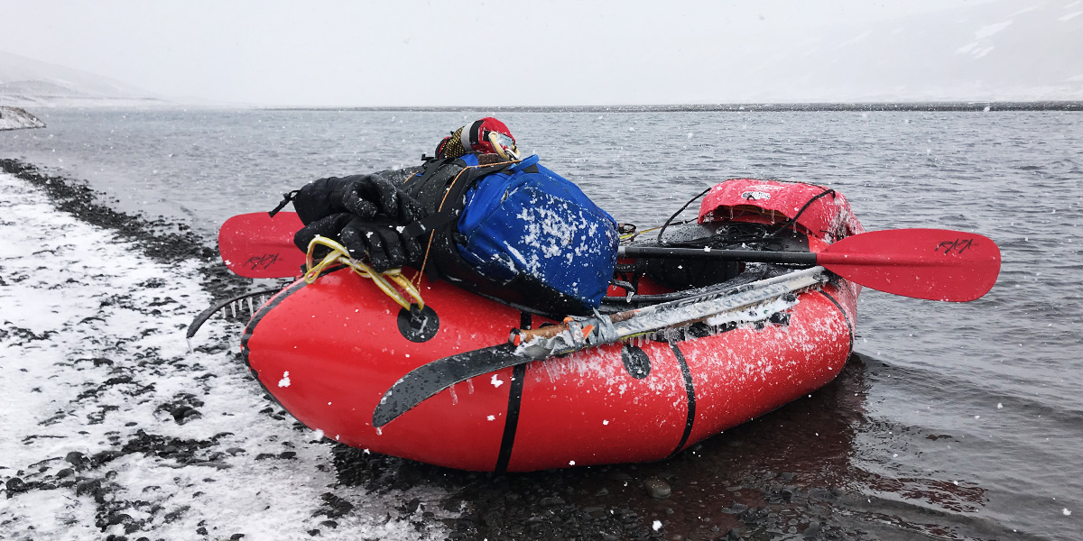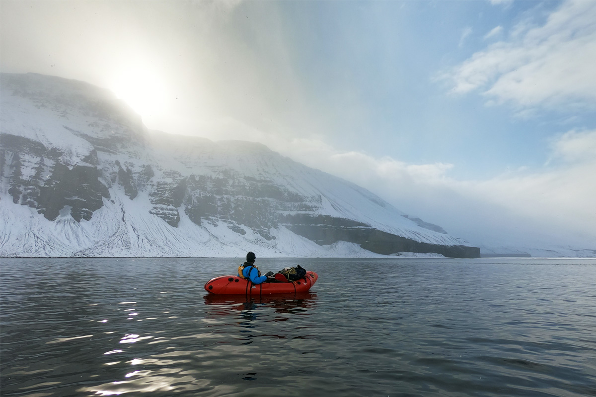 We could hear the ocean breakers now as they pounded the thin spit of sand that separated our river from the sea. The Skjalfandafljot opened finally into a wide estuary, riven with submerged sand banks, the main channel hidden. It felt like our final test as we dragged our rafts from sand bank to sand bank amongst the swirling snow. At last we saw the cliffs and the river mouth. The wind dropped. A pulse of sunlight through a broken sky brought an ethereal glow to the lagoon through which we now paddled. It was as if we had been released and allowed to finish our journey, the malevolent spirit of Iceland’s weather finally, begrudgingly, allowing us to pass.